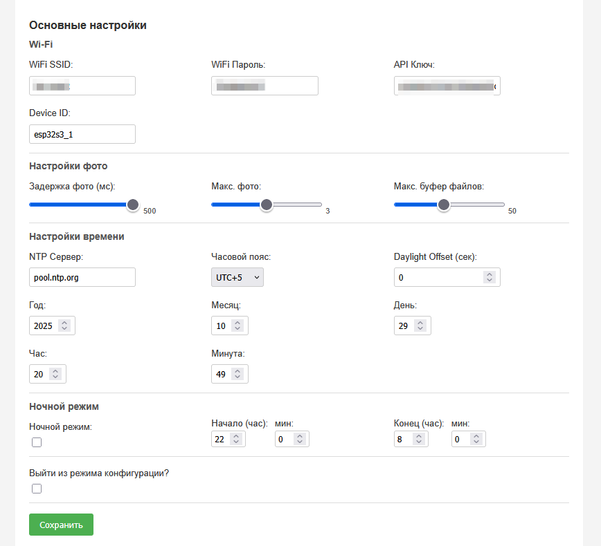 В качестве папарацци выступает малыш Seeed Studio ESP32-S3 Sense, HC-SR501 (датчик движения), AHT20+BMP280 высокоточный метео датчик, измеряющий температуру, влажность и атмосферное давление, а так же модуль часов реального времени DS3231. Корпус был напечатан на 3Д принтере. Часть прошивки была позаимствована у выше упомянутого Andrew Evans. Были внесены корректировки, а именно: