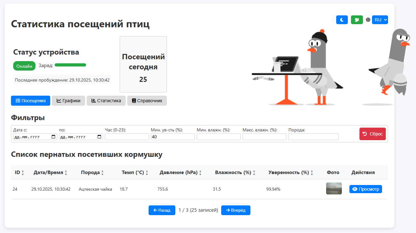 Bird Feeder - Система использует микроконтроллер ESP32-S3 с камерой для фиксации изображений птиц, сбора данных о погоде (температура, давление, влажность) и отправки их на сервер. На сервере происходит обработка изображений с помощью моделей машинного обучения для детекции и классификации птиц, хранение данных в базе данных SQLite и предоставление веб-интерфейса для просмотра статистики.